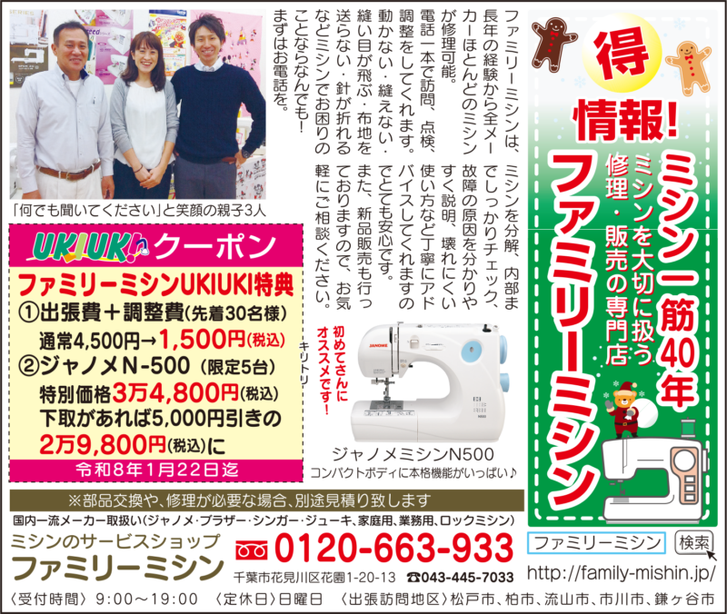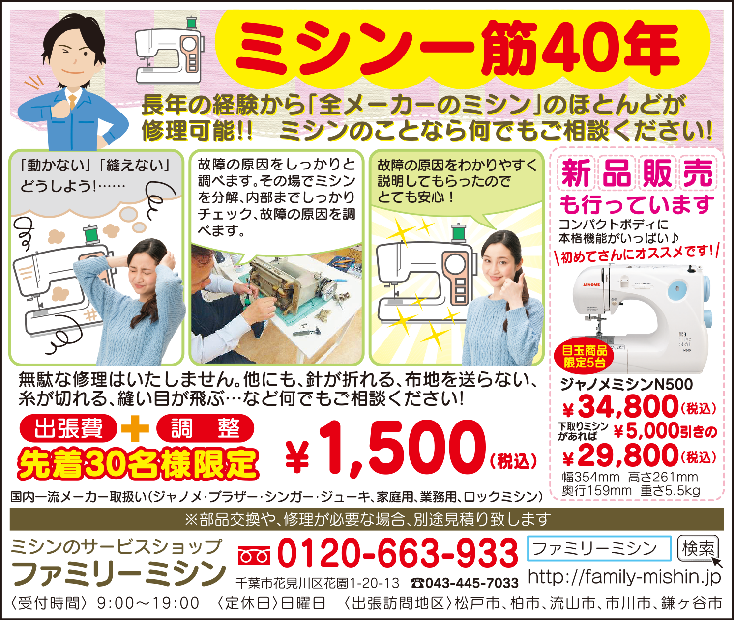 電話一本で訪問、点検、調整をしてくれます。動かない・縫えない・縫い目が飛ぶ・布地を送らない・針が折れるなどミシンでお困りのことならなんでも!まずはお電話を。