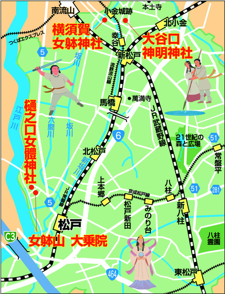 松戸市内・江戸川東岸にある「横須賀女躰神社」と「樋之口女體神社」は、ともに国生み・神生みの女神「伊邪那美命(いざなみのみこと)」を祭神としています。また、かつて大谷口にあった「女躰神宮」の祭神は「女躰神宮尊」と伝えられ、これは在地の女神を尊称した名と考えられます。