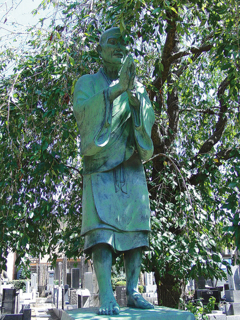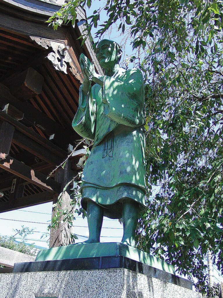 本福寺の境内に入ると、左手の釣り鐘の隣に、一遍上人の銅像を仰ぎ見ることができます。