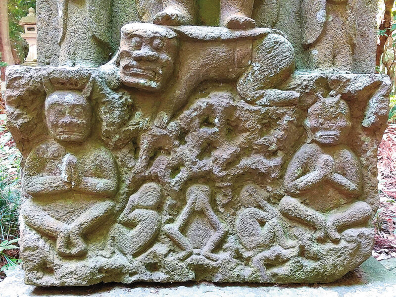 あらためて塔を見てみましょう(写真)。下部中央に、左から言わざる・見ざる・聞かざるの三猿が並び、その両側で夜叉(鬼神)が合掌。各夜叉の上には、同じく二人の童子が佇みます(三猿、そして夜叉や童子は、青面金剛とセットで扱われることの多いキャラクターです)。