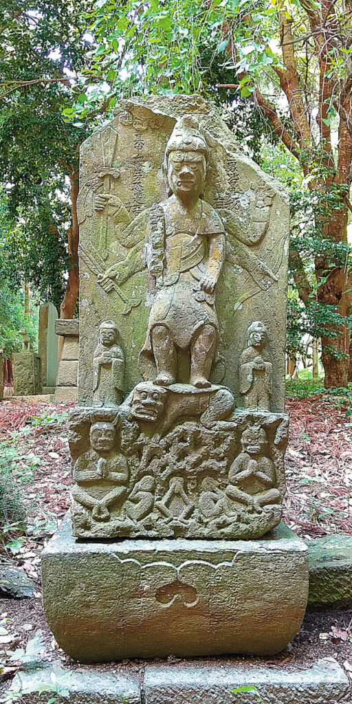 八幡神社内にある1719(享保4)年造立の塔です。主役は、邪鬼を踏み、6つの腕に法輪や弓、矢などを持った青面金剛(しょうめんこんごう)。庚申講の本尊です。