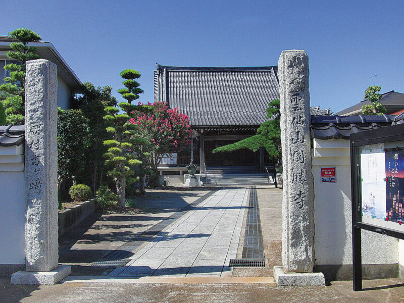 圓勝寺は勢至菩薩を本尊とし、もとは江戸川堤防内側にありましたが、大正四年の江戸川改修工事により現在地に移転した歴史をもちます。同寺に移された、松戸市内最古とされる慶安三年(一六五〇)の板碑型庚申塔は、境内入ってすぐ右手に鎮座しています。 (かつ)