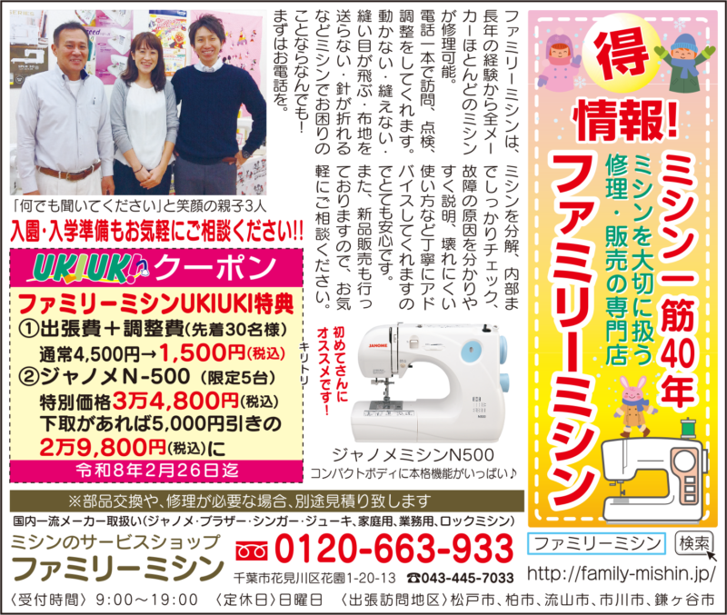 電話一本で訪問、点検、調整をしてくれます。動かない・縫えない・縫い目が飛ぶ・布地を送らない・針が折れるなどミシンでお困りのことならなんでも!まずはお電話を。
