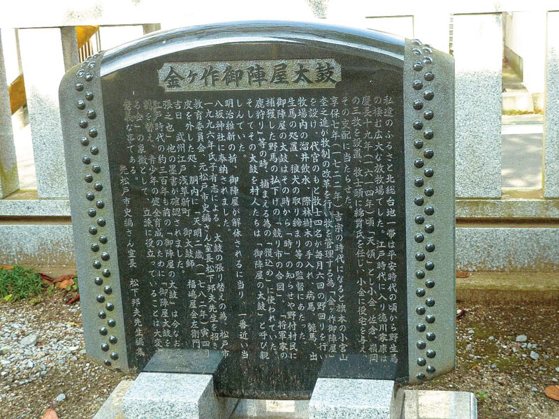 慶應4年(1867)の江戸幕府崩壊後間もなく、役所だった金ヶ作陣屋は姿を消しました。しかし、唯一残っていたのは、陣屋で使われていた太鼓です。金ヶ作陣屋では、毎年、放牧している野馬を捕まえ、捕獲する馬を陣屋に引き連れてきて、セリを行い、町民などに売っていました。その際のふれ太鼓や、様々な行事で使われていた太鼓です。