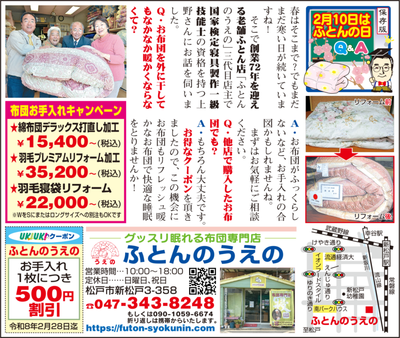そこで創業72年を迎える老舗ふとん店「ふとんのうえの」三代目店主で国家検定寝具制作一級技能士の資格を持つ上野さんにお話を伺いました。