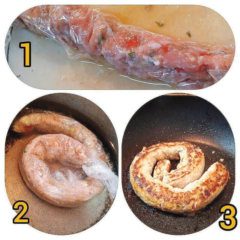 一見難しそうな「手作りソーセージ」ですが、実は意外と簡単におうちで作れちゃうんです!今回は見た目もダイナミックな「ぐるぐるソーセージ」の作り方をご紹介します。豚ひき肉適量(牛豚合びき肉や鶏ひき肉でもOK)、塩とコショー少々、お好みで野菜やハーブのみじん切り少々をよく混ぜ合わせて肉だねを作ります。写真①のように、肉だねを程よい太さの棒状にしてラップで巻いたら両端を輪ゴムで結びます。