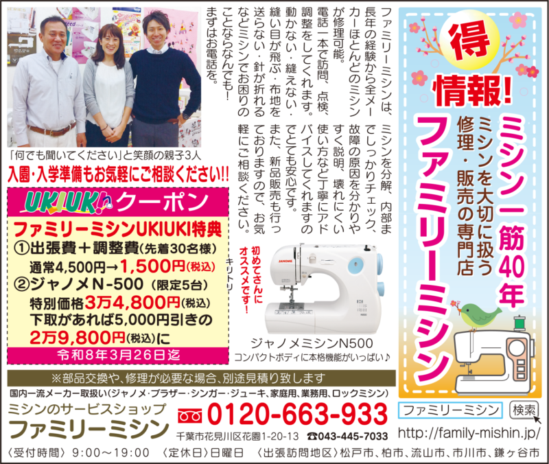 電話一本で訪問、点検、調整をしてくれます。動かない・縫えない・縫い目が飛ぶ・布地を送らない・針が折れるなどミシンでお困りのことならなんでも!まずはお電話を。