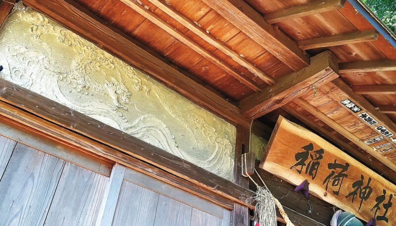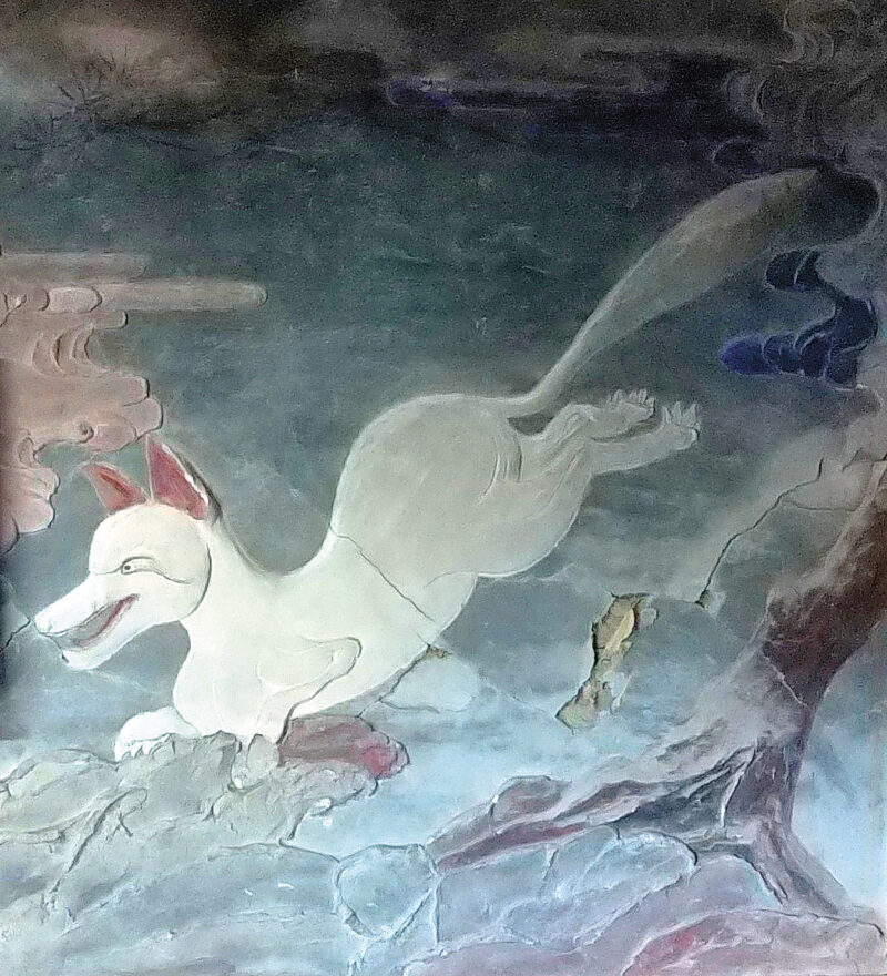 境内には精悍な狛犬や眼光鋭い狐の像など、多様な石造物が。また、社殿外側の扁額の両脇には、壁面に龍を描いた鏝絵(こてえ)が見られ、個性的です。実は社殿内にも正面側の左右の壁に鏝絵があり、しかも色つきです!右も左も、主に青灰色の広い地に白狐が躍り、薄茶なども配され、仄かで夢幻的。ただ残念なことに、普段は社殿の中に入れません。筆者は宮司様や役員の方の承諾を得て、今年の元日に見学・撮影しました。