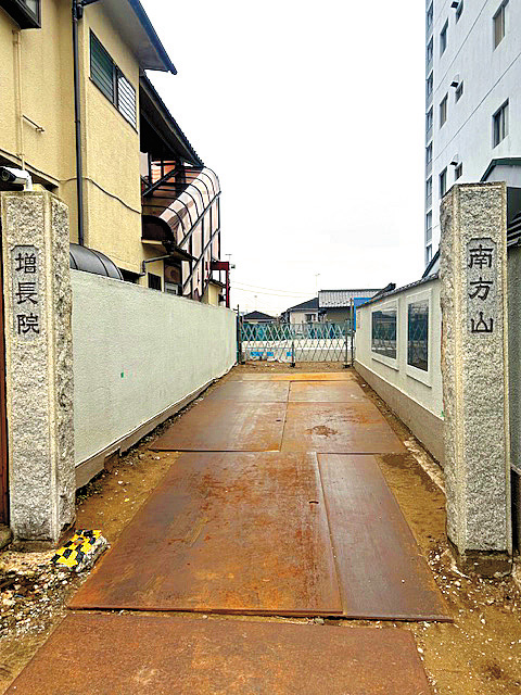 江戸川左岸は下総国ですが、右岸は武蔵国葛飾郡である。金町は江戸府内でしたから水戸街道を渡しで継ぐ金町松戸の渡しは重要な関門であり、金町側には関所が設けられていました。その場所には金町関所跡之碑が建っています。江戸川松戸側堤防より下横町に入り直進すると丁字路に突き当たる。その角目に当たる事から角町(かどちょう)と言われる。北は水戸街道、南は通称八幡街道(千葉県道1号市川松戸線)と分れ、県道の西側が小山になっている。角町三叉路に天台宗円慶寺があり、その近く小山に現在建て替え工事中の南方山増長院がある。工事案内によりますと完工2026年4月10日と記されています。本堂に通じる小路壁に「本堂庫裡新築記念碑竣工昭和44年3月吉祥日」現在工事中の本堂はこの新築碑に継ぐものと思われます。昔から小山のお寺と呼ばれた古いお寺ですが明治の大火ですべての記録が消失した。増長院山号の由来は仏教の守護神四天王の一尊で南方を守った「増長天」にあります。ご本尊は11面観世音菩薩(菩薩の頭に十の観音があって喜怒哀楽を表している)増長院前道路を隔てた電信柱には、下総88ヵ所第64番札所増長院御朱印受付時間午前9時~午後4時と案内が掲げられているように東葛飾郡の下総4郡新四国88ケ所巡りでは第64番霊場になっています。(ゴジラ)
