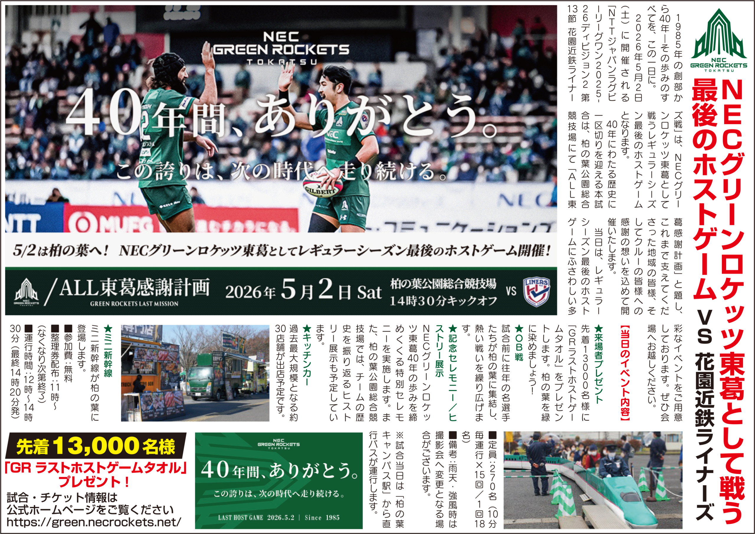 2026年5月2日(土)に開催される「NTTジャパンラグビーリーグワン2025-26ディビジョン2 第13節 花園近鉄ライナーズ戦」は、NECグリーンロケッツ東葛として戦うレギュラーシーズン最後のホストゲームとなります。