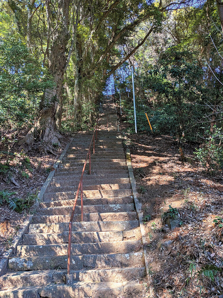 御朱印をいただいた後は、境内を散策。すると階段を発見しました。下をのぞくとメチャクチャ急勾配の階段です。しかも石段のサイズや並びがバラバラで、これはあきらかに古いもの。駅の階段は均等だから昇降は楽。手すりがなくても、まあ平気ですよね。でもここは、手すりがないと危険です!その手すりも高さがバラバラ……。ゆっくり下ると、そこそこ時間がかかります。やっとのことで下にたどり着くと、そこは車で登ってきた道の途中。側に駐車場がありますが、そこに車を止めて階段を利用する人はいるのでしょうか?さて、登らなければ、境内に戻れません。登りもやはりキツイ!休みながらどうにか登り切った時は、息を切らし汗だくでヘトヘトでした。